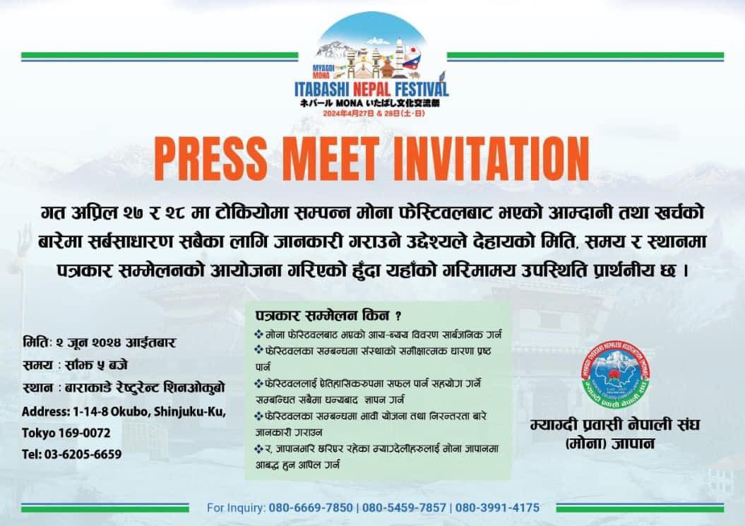 म्याग्दी प्रवासी नेपाली संघ (मोना) जापानको आयोजनामा २०२४ अप्रिल २७ र २८ का दिन जापानको राजधानी टोकियोमा सम्पन्न म्याग्दी मोना इतावासी नेपाल फेस्टीबल २०२४ को समिक्षा, पत्रकार सम्मेलन २०२४ जुन २ तारीकमा आयोजना गरीने भएको छ । मोना फेस्टीबलबाट भएको आम्दानी तथा खर्च सार्वजनीक तथा भएका कमी कमजोरीहरुको समिक्षा गरी आगामी दिनमा गरीने कार्यक्रममा सुधार गरी जान सहयोग हुने उद्देश्यले समिक्षा कार्यक्रम गर्न लागीएको हो । सम्पुर्ण सरोकारवाला निकायहरुलाई पत्रचार गरीएको छ यदी पत्र प्राप्त नभएको भएमा यसै सुचनालाई आधार मानेर सहभागीताका लागी हार्दिक अनुरोध गर्दछौ ।