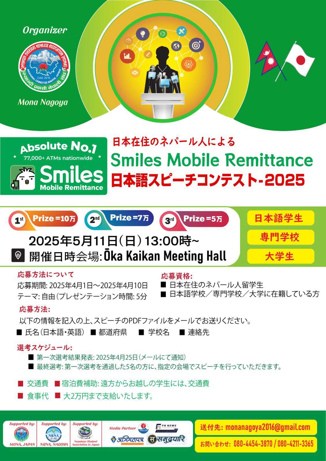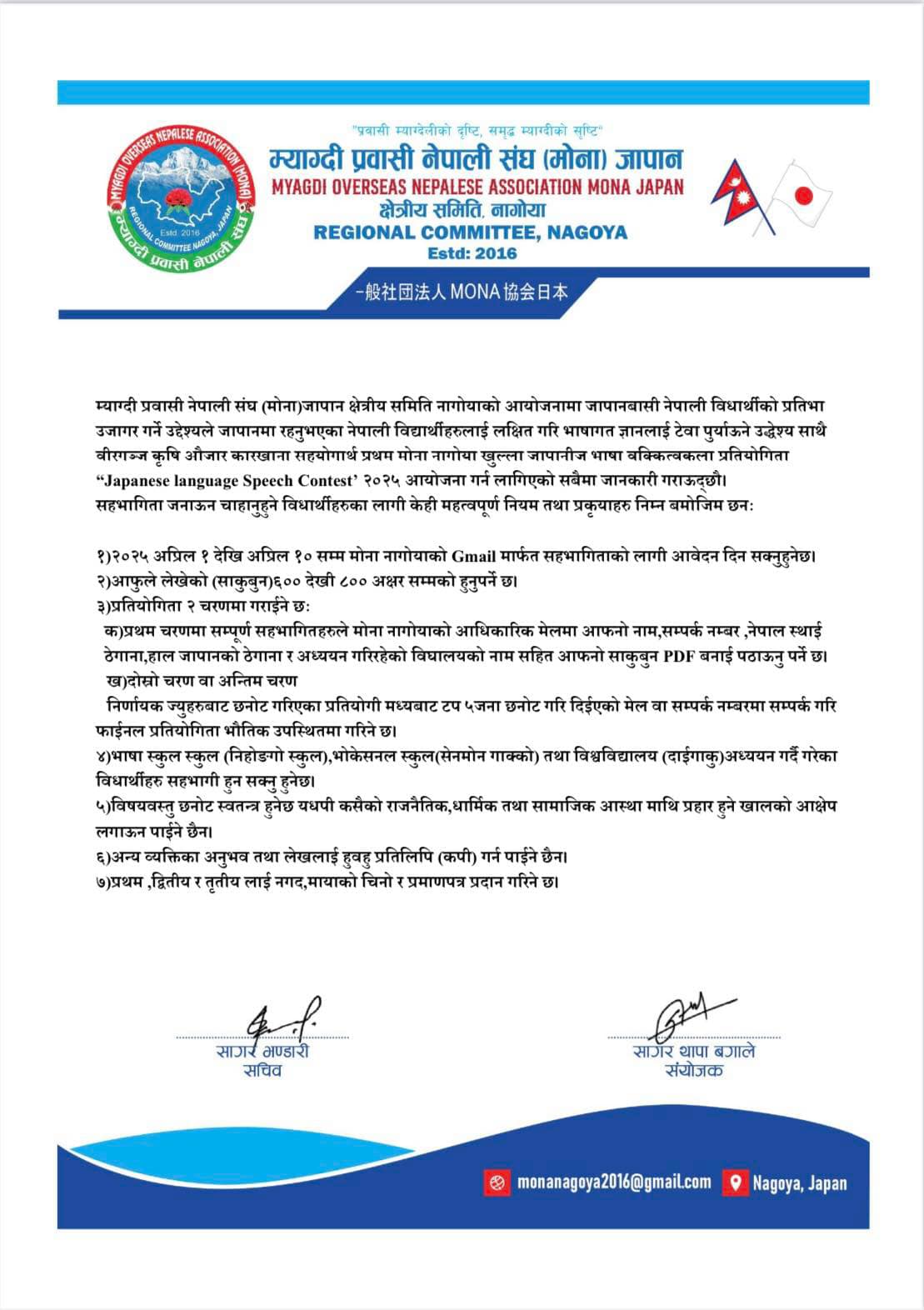 म्याग्दी प्रवासी नेपाली संघ (मोना) जापान क्षेत्रीय समिति नागोयाले मोना नागोया खुल्ला ‘Speech Contest’ २०२५ कार्यक्रम गर्ने भएको छ ।